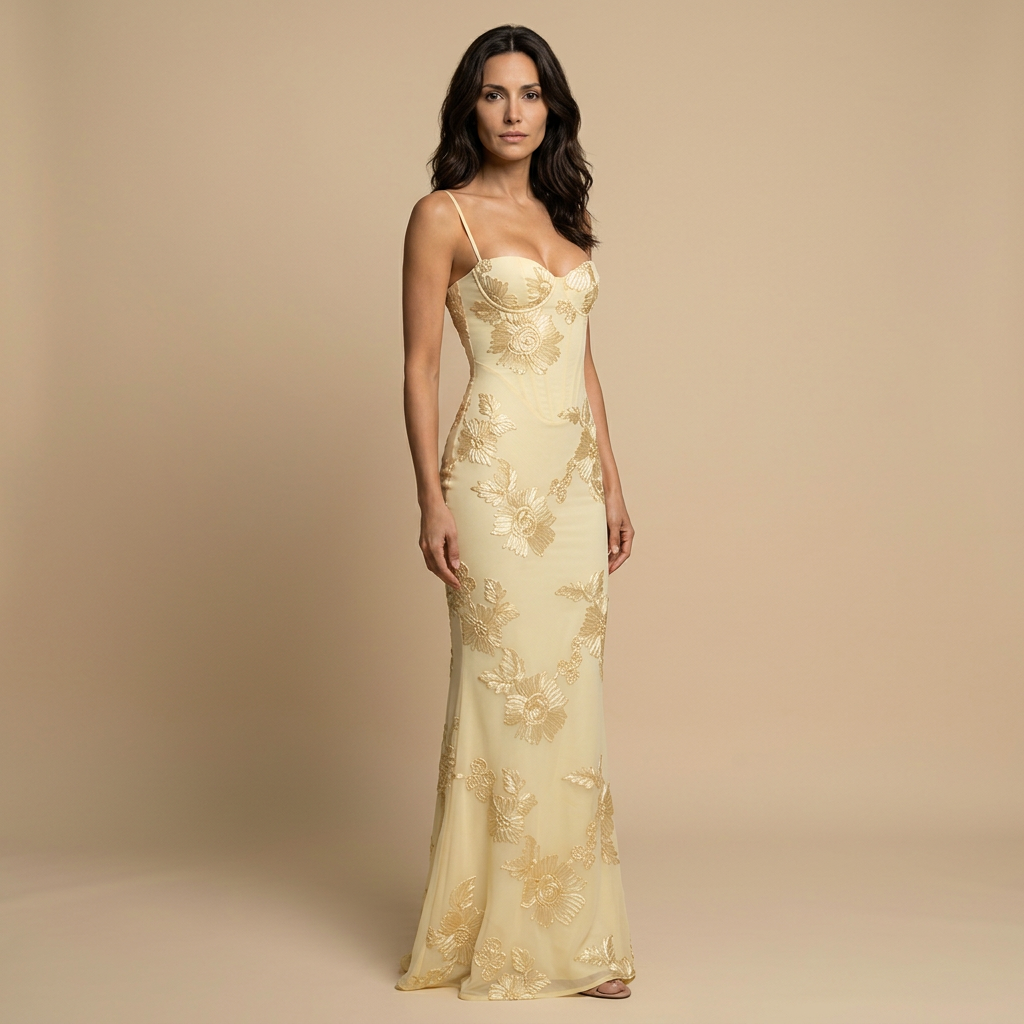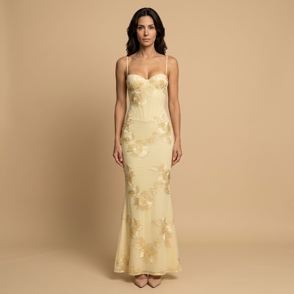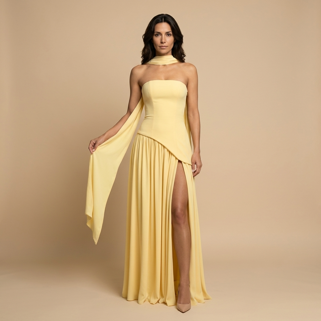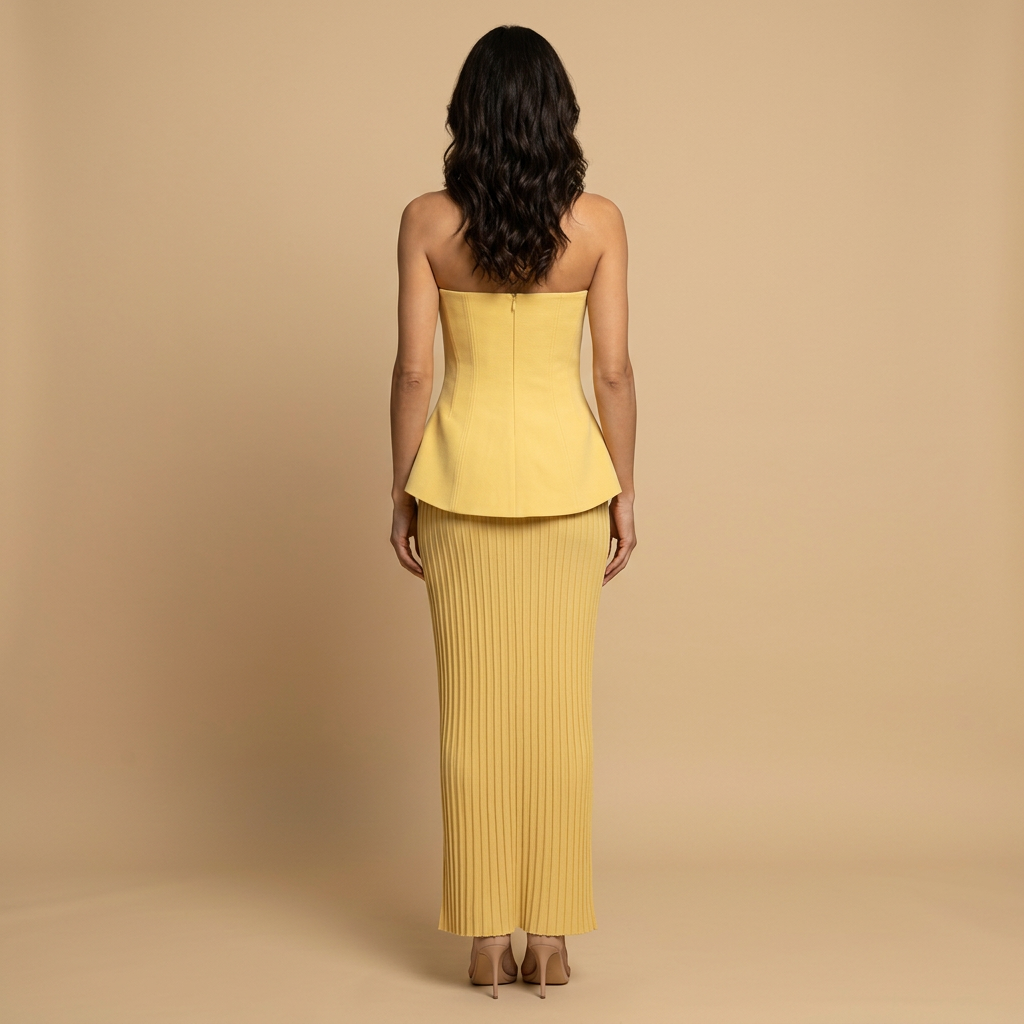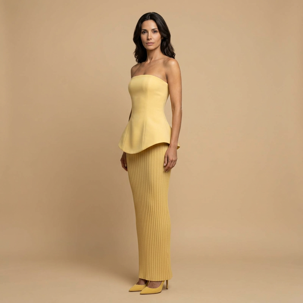 Palabra de honor estructurado con peplum de vuelo controlado y falda maxi tubo en punto acanalado fino. Un diseño bitextural de construcción sofisticada que combina el crepé liso del cuerpo con la textura vertical de la falda, creando una silueta de gran impacto para bodas, galas y eventos especiales.